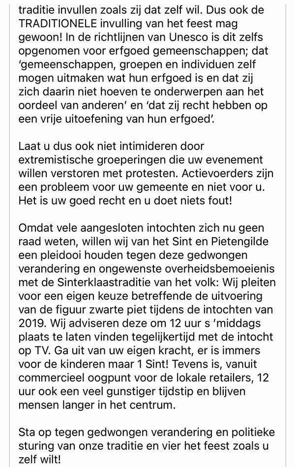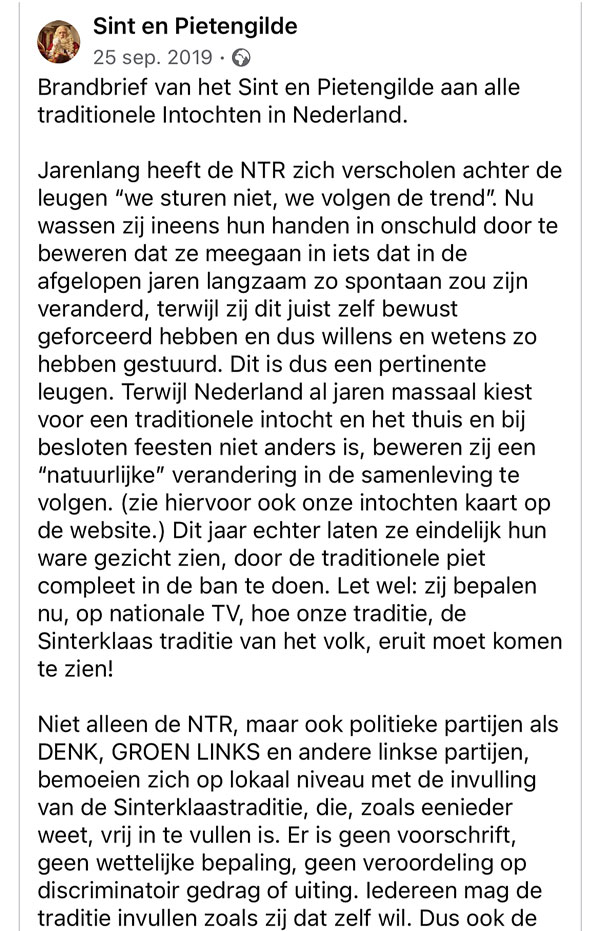 September – In een brief verzoeken wij omroep NTR geen wijzigingen meer door te voeren aan Zwarte Piet.