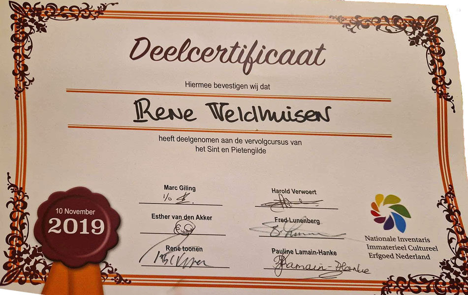15 januari – Stichting Sint en Pietengilde en het VIE tekenen voor de plaatsing van het sinterklaasfeest op de lijst immaterieel erfgoed. VIE is nu het Kenniscentrum Immaterieel Erfgoed Nederland (KIEN). Het Gilde gaat het erfgoed beheren volgens het door ons opgestelde erfgoedzorgplan.
