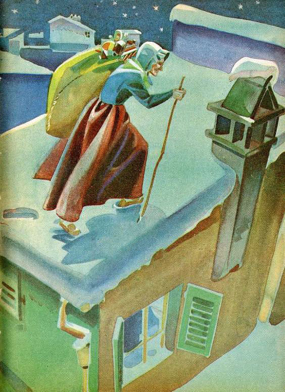 “Goed en kwaad kwamen door den schoorsteen. De boldergeest kwam er door, om plagen in ’t huis te brengen; maar ook de kaboutermannetjes kozen denzelfden weg, als ze den gelukskinderen ’s nachts een zak vol geld bragten. En zoo deed ook Sinterklaas zijn intogt door den schoorsteenpijp, zonder dat iemand ooit heeft kunnen merken, dat zijn ,,slickerdemickjes” naar ’t roet smaakten.