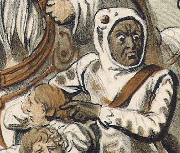 “Toenmaals was er nog een bullebak. Dit was een grimmig man, met een zwart gezigt, of wel een masker voor hetzelve, in eene vreemde, lelijke kleeding, met een ‘zak op den rug en een bloot zwaard in de hand.