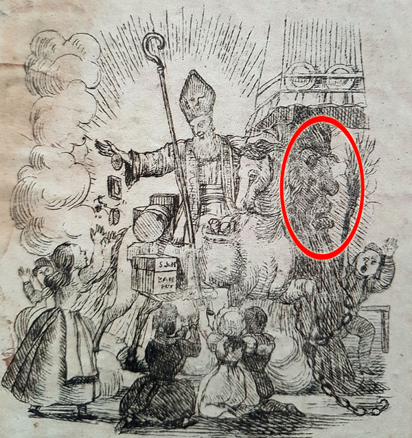 Op deze tekening van Nederlandse oorsprong uit 1840 zien we deze boeman. Zijn relatie met de schouw/schoorsteen is overduidelijk en zijn duivelse oorsprong onmiskenbaar.