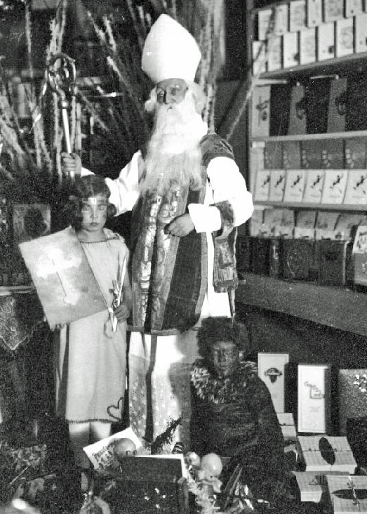 1944 Sloveense Sint Nicolaas en zijn donkere helper, Krampus, met een krullenpruik en hoorntjes op zijn hoofd! Let ook op de kraag. Hier liggen gelijkenissen met Zwarte Piet. Ook hier het zwarte gezicht, een mand (zak). Verder wordt Sint vergezeld door een engel.