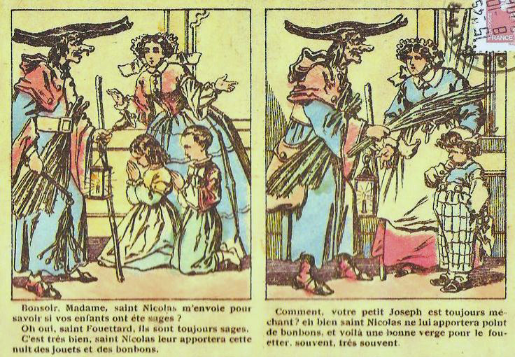 Père Fouettard of Saint Fouettard uit Frankrijk: een donker gezicht met zweep, ook wel Vader Geselaar genoemd in België.