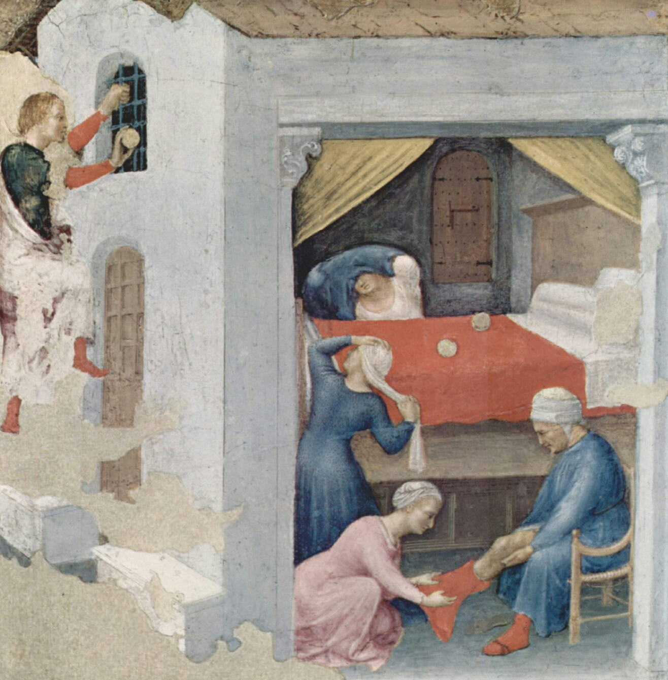 Toen Sint Nicolaas hoorde dat een man de bruidsschat van zijn dochters niet kon betalen en genoodzaakt was hen in de prostitutie het geld voor het gezin te laten verdienen, gooide Sint Nicolaas tot driemaal toe een bruidsschat naar binnen zodat de meisjes eerbaar konden trouwen.