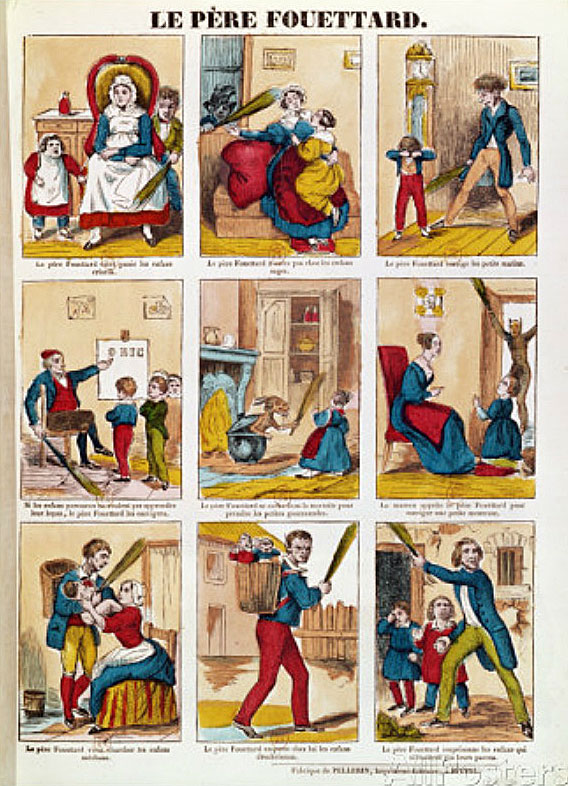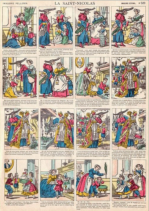 Verder gaat het hier om Père Fouettard, ook wel Vader Geselaar 1) genoemd. Deze heeft hier wel een heel bijzondere hoed op en een enorm lange neus, dat wijst op een maskerade. In de Nederlandse vertaling wordt gesproken over Zwarte Knecht en dat is logisch omdat het op die manier, waar mogelijk is aangepast aan de Nederlandse situatie. We zijn deze figuur echter ook wel eens tegengekomen terwijl hij als Saint Nicolas of Saint Fouettard wordt aangeduid.