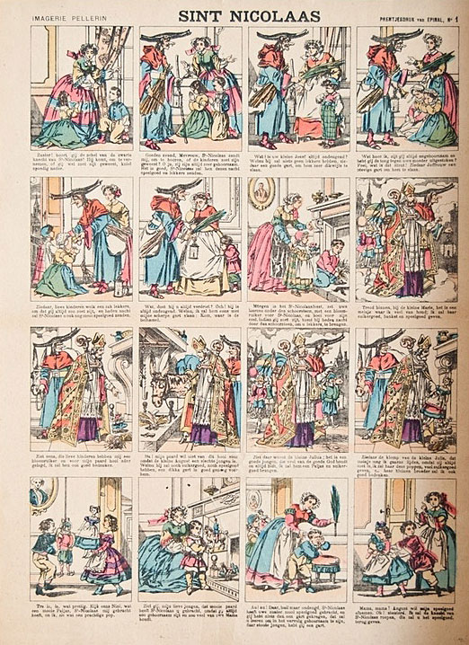 Onderzoek wijst uit dat het gaat om een van oorsprong Belgische prent. Dat blijkt ook uit het feit dat Sint op een ezeltje rijdt, dat is gebruikelijk in België en Frankrijk.