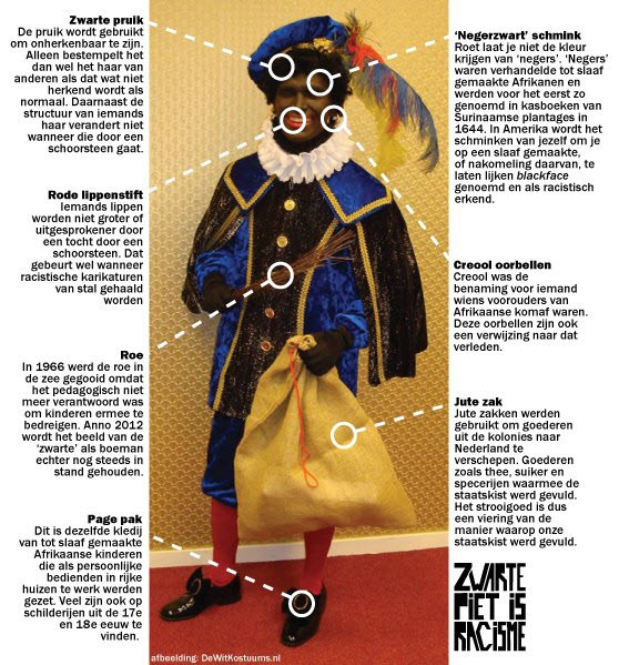 Tegenstanders van Zwarte Piet beweren dat ook: ‘Zwarte Piet is een figuur gebaseerd op de stereotyperende weergave van zwarte mensen in de 19e eeuw. Zijn verschijning refereert direct aan de Nederlandse geschiedenis van kolonialisme en slavernij. Ondanks de vele verhalen die er bestaan over de oorsprong van Zwarte Piet is dit de enige plausibele verklaring voor zijn huidige uiterlijk.’